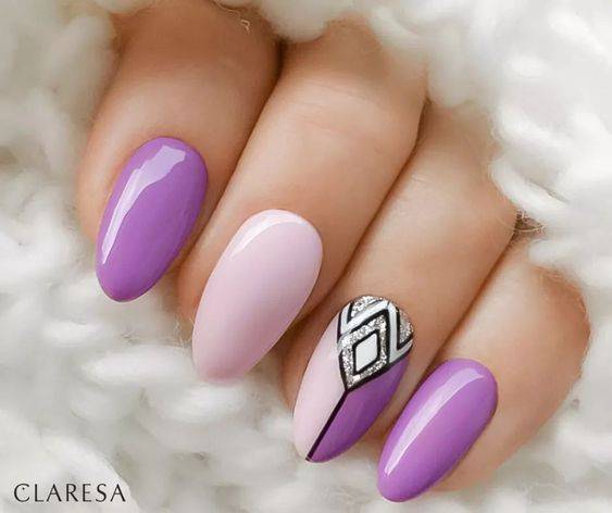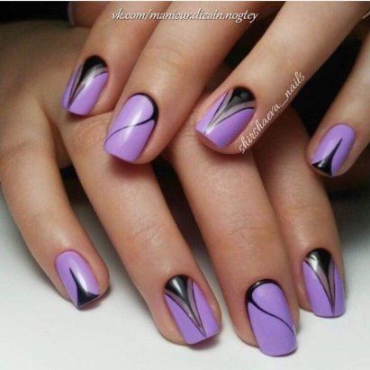 - Зеркальный сиреневый маникюр с черным контрастом. Несложный растительный узор белого цвета гармонично соединяет два разных эмоциональных цвета.