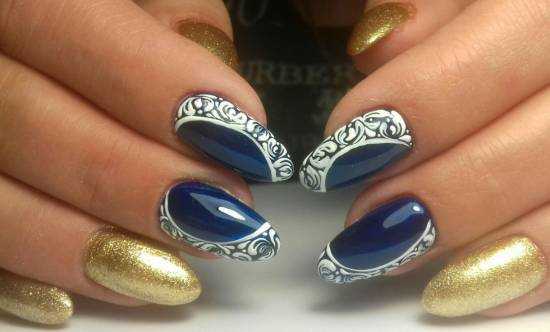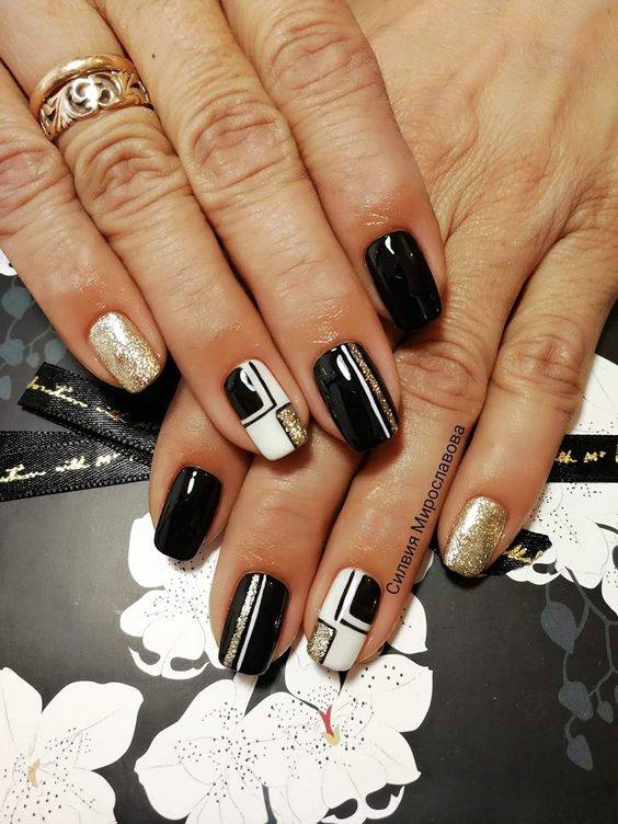 Вообще, все сочетания с черным цветом относятся к классическому стилю, как в одежде, так и в дизайне ногтей. Черно золотой маникюр великолепно украсит ногти деловой женщины, которая хочет добавить в свой строгий образ некую изюминку. А сочетать маникюр золотой с черным можно разными способами.