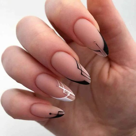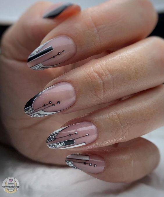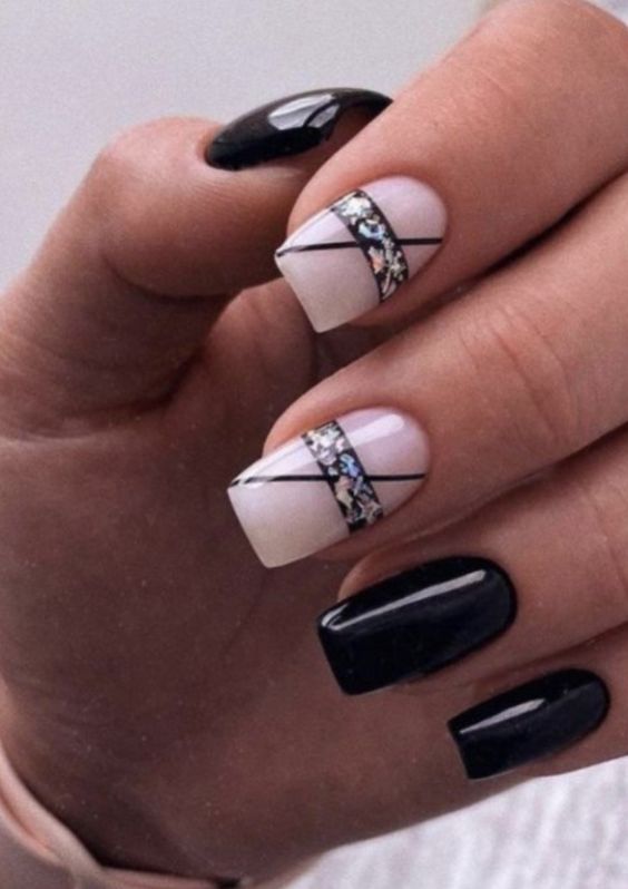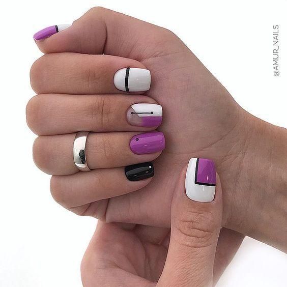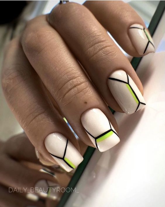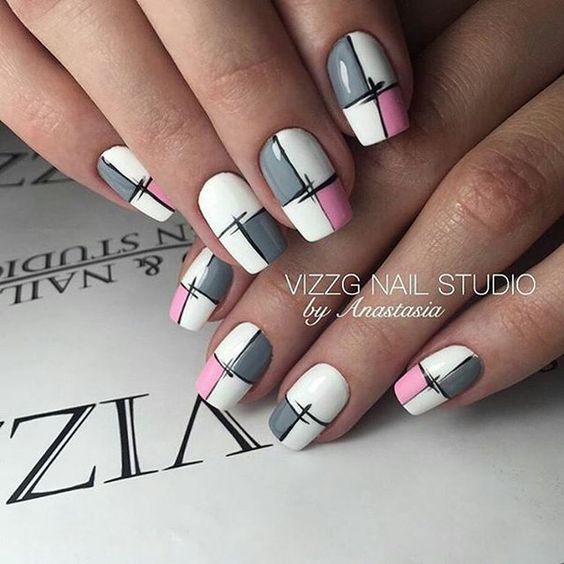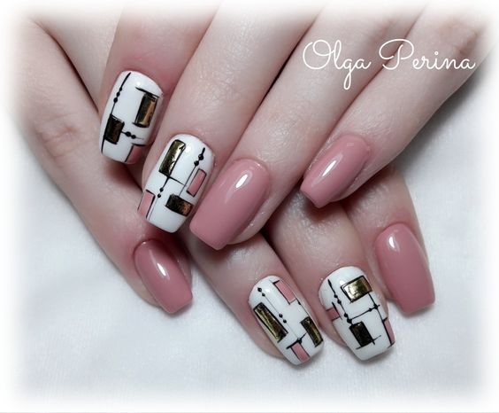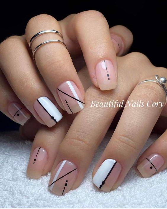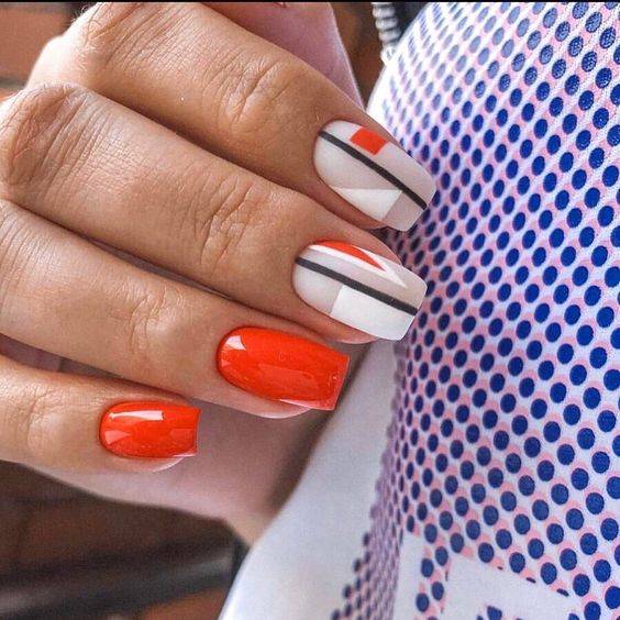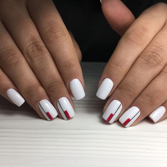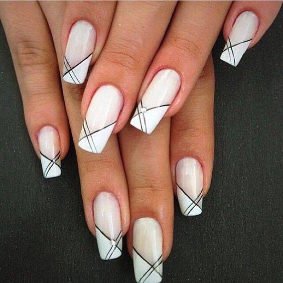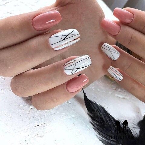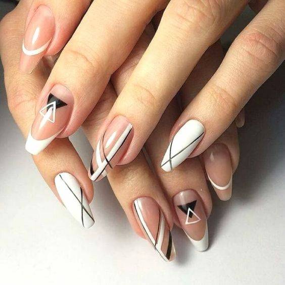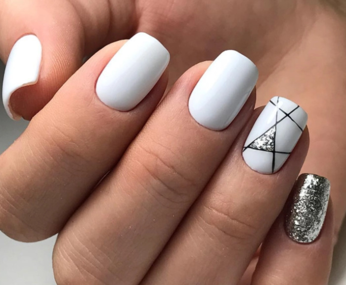 - Френч с геометрическим акцентом смотрится стильно и легко. Использован белый контраст и черная обводка.