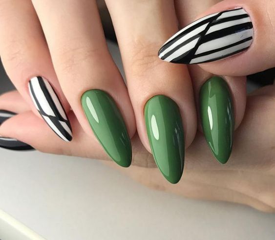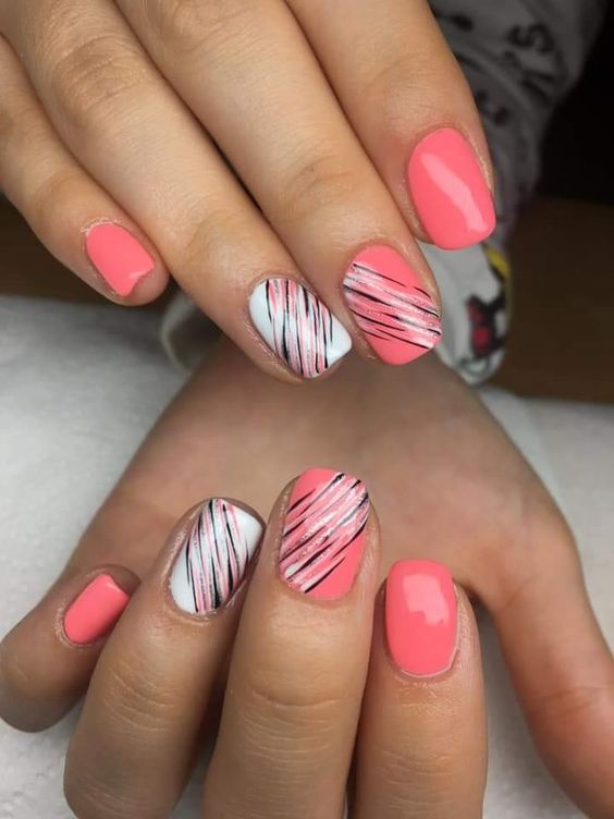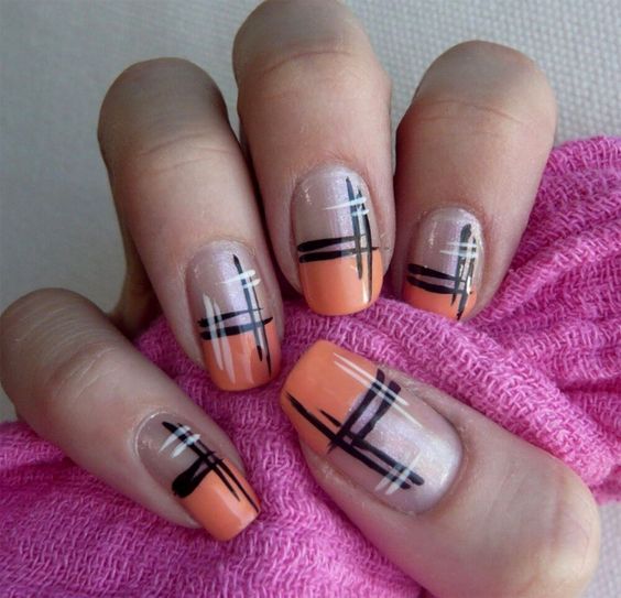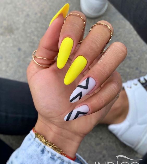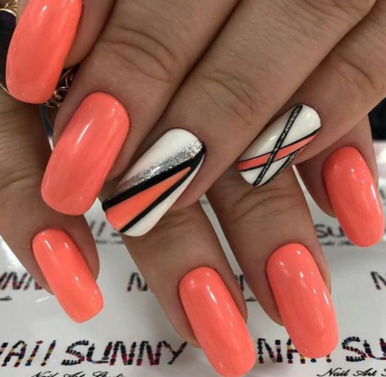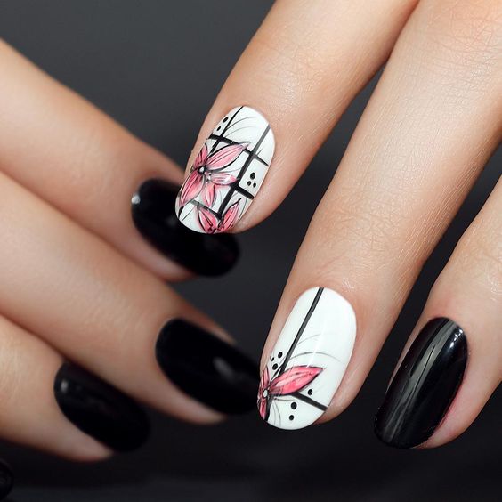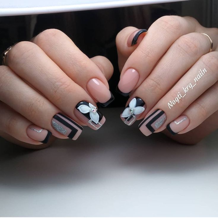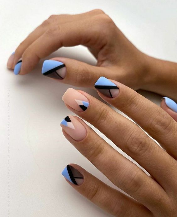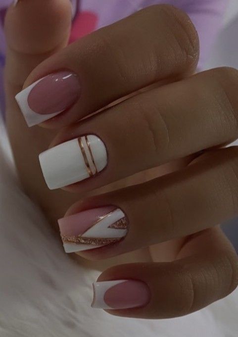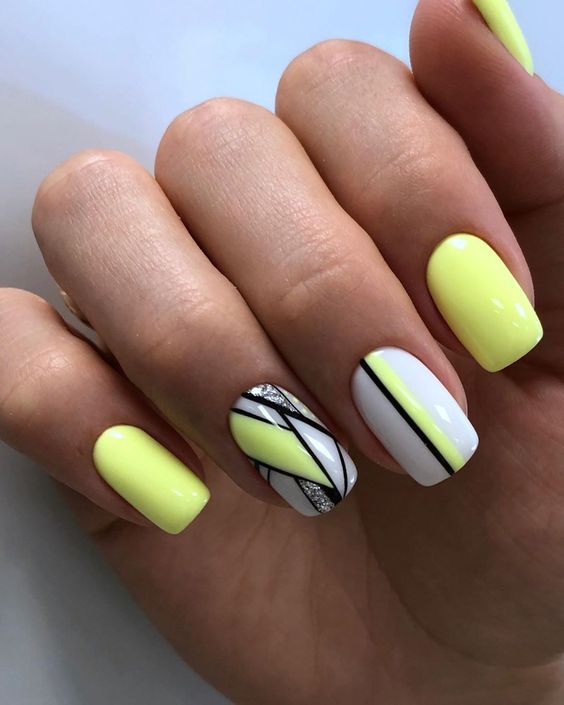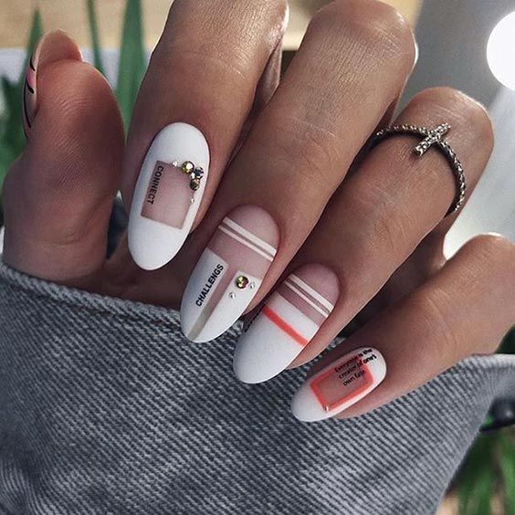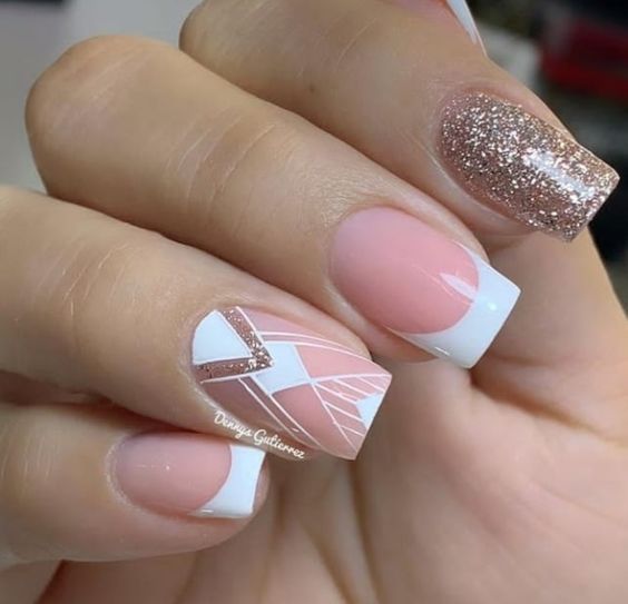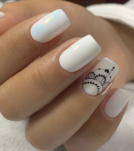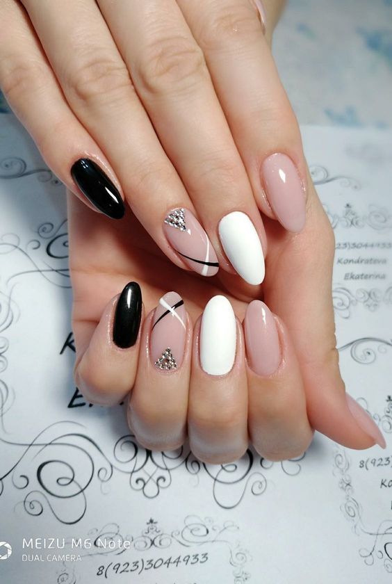 - Френч с геометрическим акцентом смотрится стильно и легко. Использован белый контраст и черная обводка.