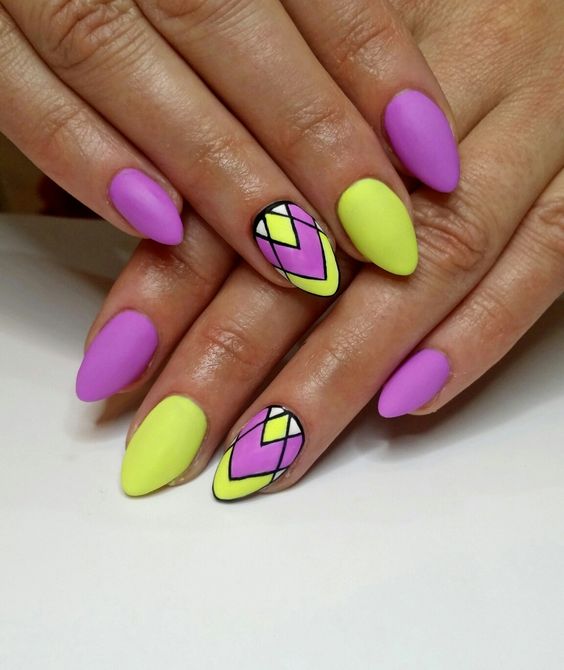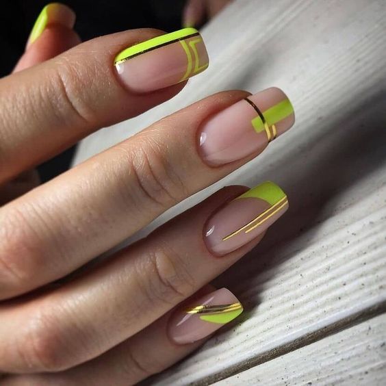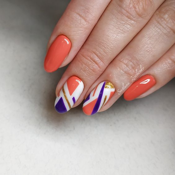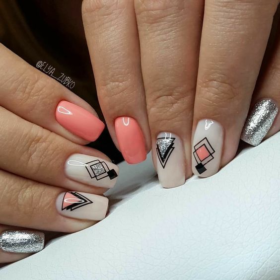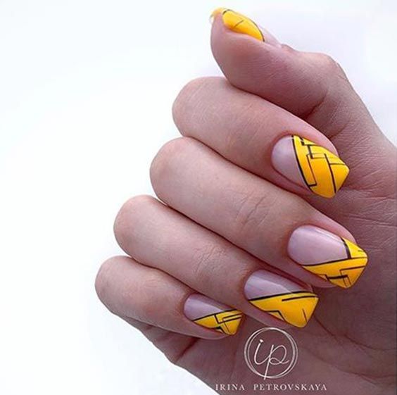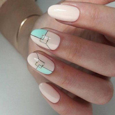 Лунный нейл-арт давно успел стать классикой. Геометрия лишь освежила его. В тренде простые и сложные геометрические фигуры на прозрачном или цветном фоне. Предварительно наносят точечную разметку.