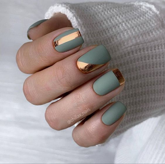 - Золотистый цвет не полностью закрасит часть ногтя, а ляжет на него как пыльца. Получится очень красиво и стильно.