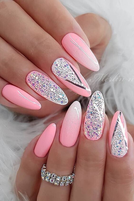 Интересно! Профессионалы отмечают, что глиттер лучше всего смотрится на лунках или кончиках ногтей. Также его можно использоваться для полного покрытия одного или нескольких ногтей в маникюре.