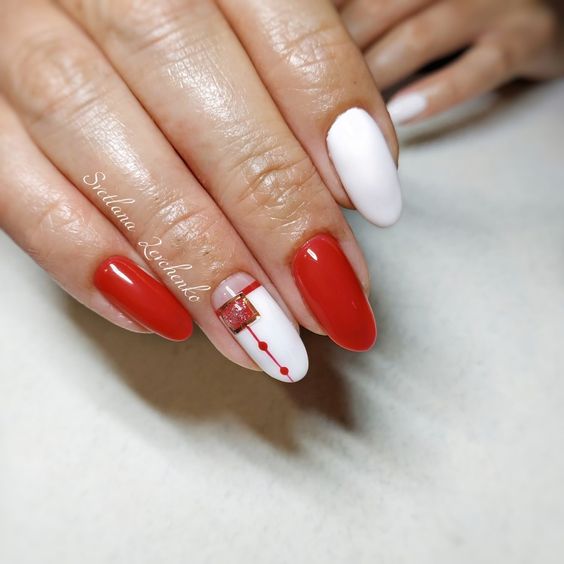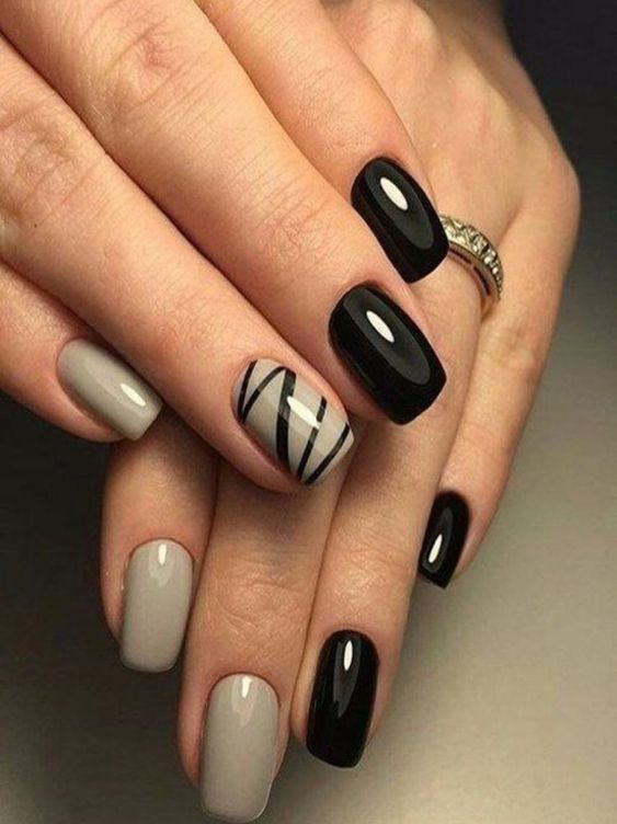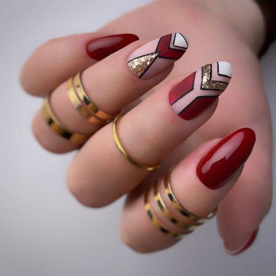 Красные оттенки сами по себе считаются чувственными и страстными, из-за этого такие цвета маникюра подходят тем девушкам, которые не боятся быть в центре внимания и быть яркими. Черный добавляет еще больше глубины этому дизайну. Несмотря на то, что красно-черный маникюр темный и строгий, он вносит в образ загадочность и подчеркивает характер своей обладательницы. Разбавить такую цветовую гамму роскошными золотыми красками – отличное решение, ведь такой дизайн подходит и для вечернего выхода, и для повседневного использования, и хорошо вписывается во многие образы. Наиболее выигрышной техникой на красно-черных ногтях будет фольгирование, придающее дизайну волнующие нотки и особый шарм. Более современно и минималистично будет смотреться техника колор блок, где можно выгодно сочетать все три цвета с помощью простых геометрических фигур.
