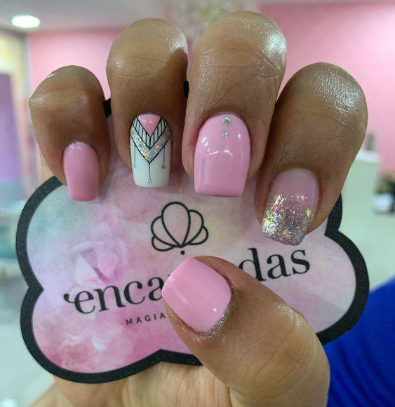 Модный маникюр на короткие ногти в стиле геометрия 2021-2022 допускает использование самых разных геометрических элементов, в том числе — стразов. Такой декор хорош тем, что его применение, с одной стороны, позволяет сделать ваши пальчики оригинальными и изящными, с другой стороны — не делает их вычурными, вульгарными. Речь идет о том уровне стилевой универсальности, который позволит вам чувствовать себя одинаково комфортно и уютно как на работе и вечерних мероприятиях, так и в повседневной жизни.