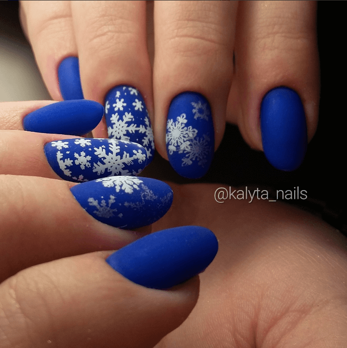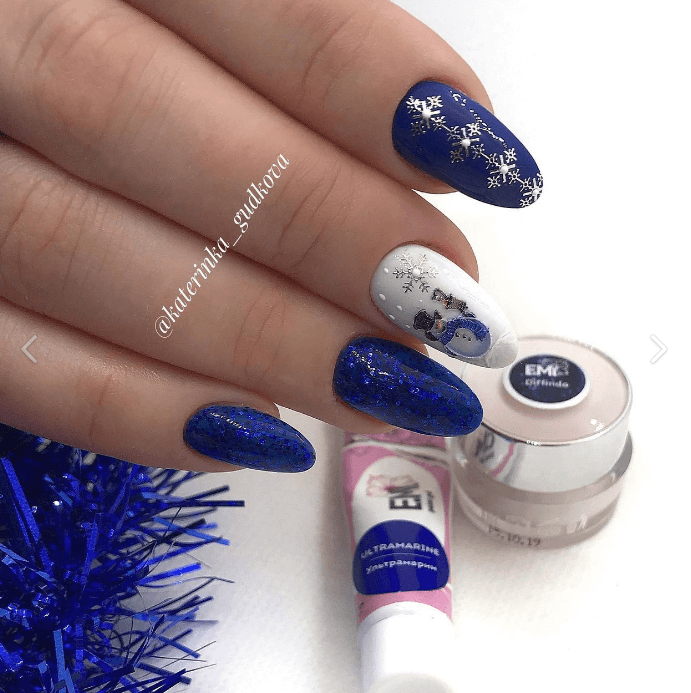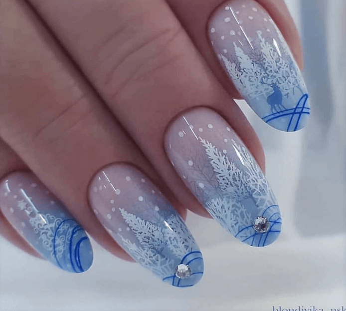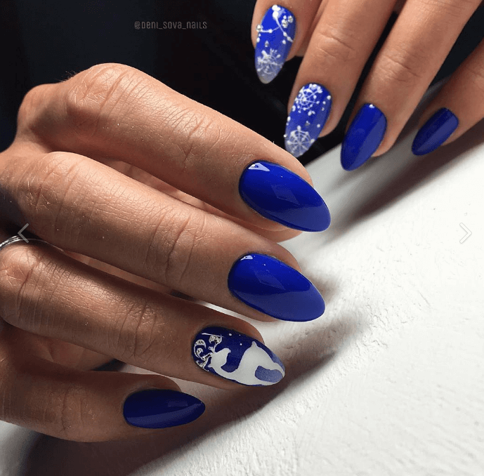 Голубой новогодний маникюр на миндале выглядит более нежно и спокойно. Тонкие морозные узоры замечательно гармонируют с этим оттенком, создавая по-настоящему зимний уют.