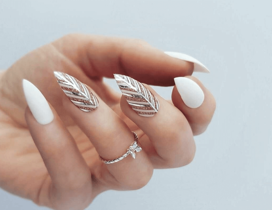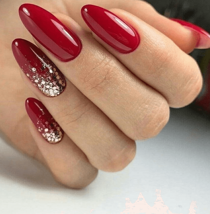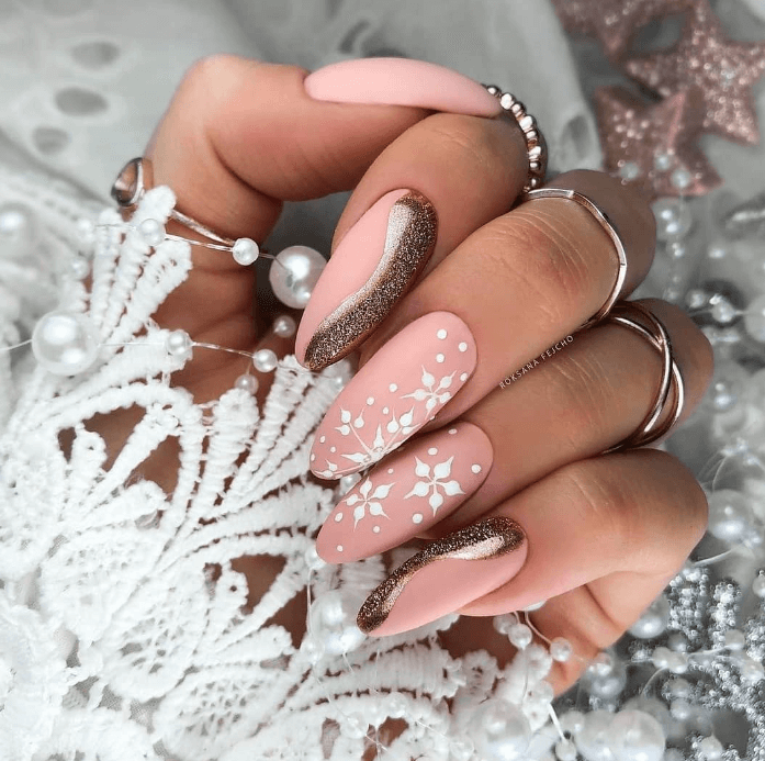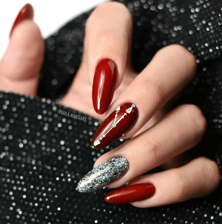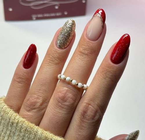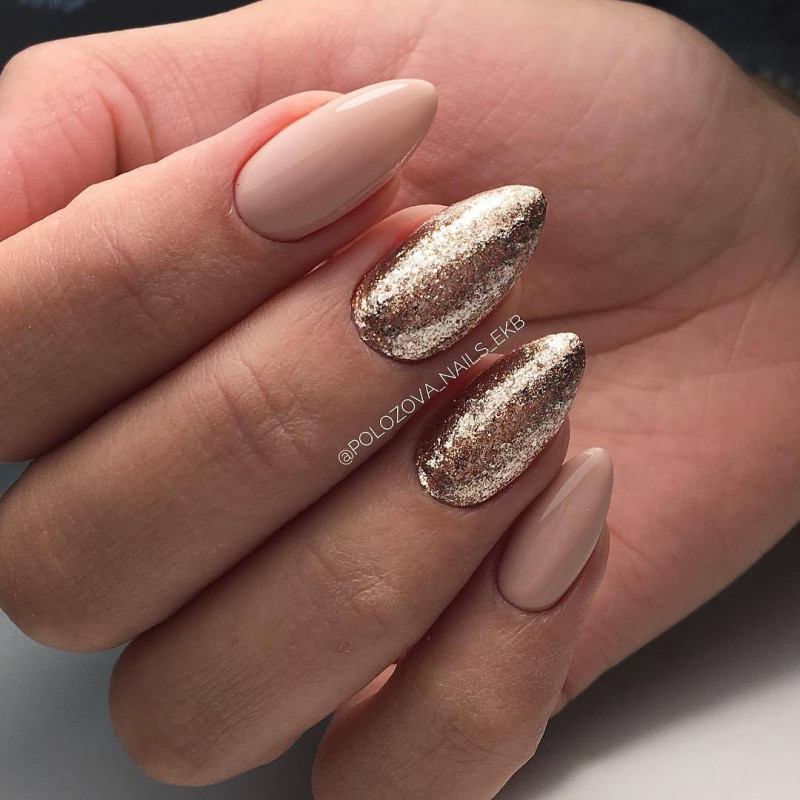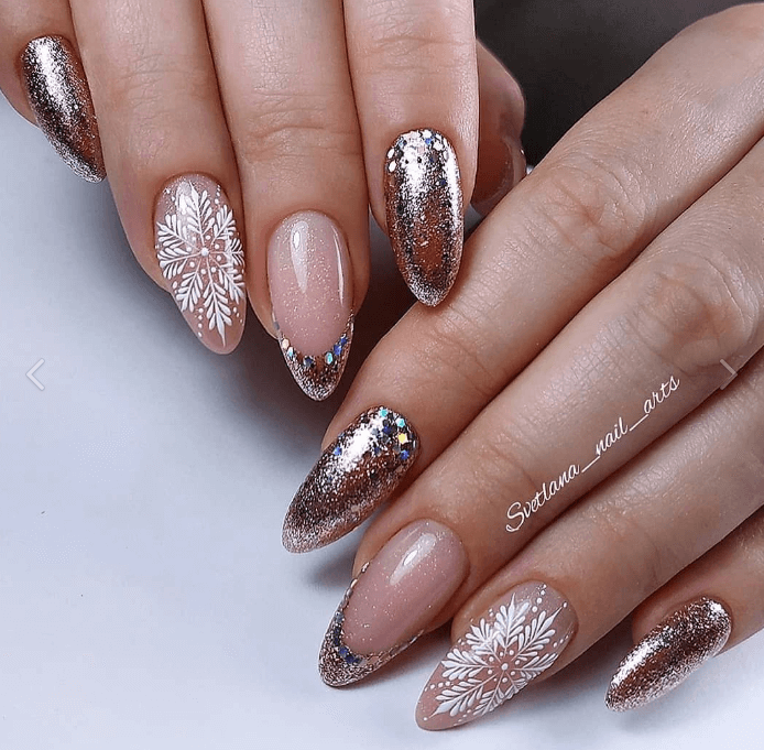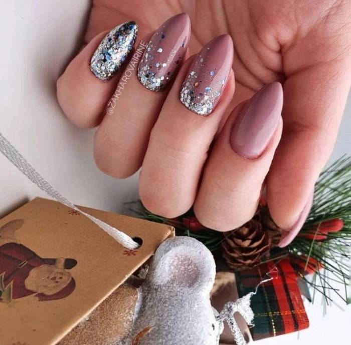 Одной из главных тенденций новогоднего маникюра на миндальную форму ногтей являются золотые и серебряные украшения. Используйте блестящий гель-лак или глиттерные пудры, чтобы придать ногтям праздничный блеск. Такой маникюр отлично будет сочетаться с любым новогодним нарядом.