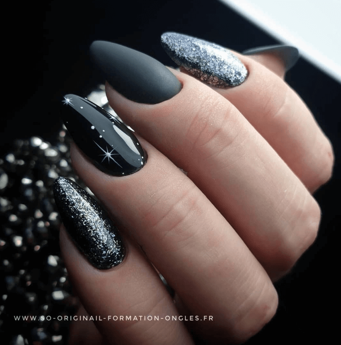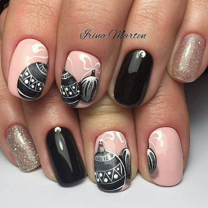 Черный маникюр на Новый год — это не мрачно и грустно, а стильно и эффектно. Все рисунки и блестки на нем смотрятся очень ярко и контрастно.
