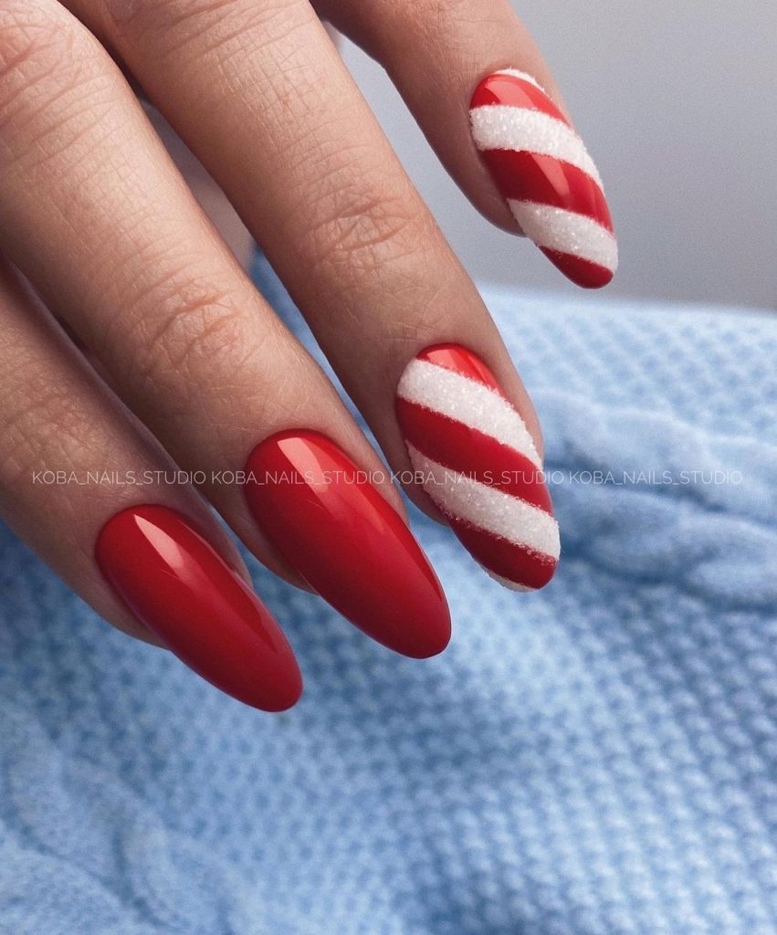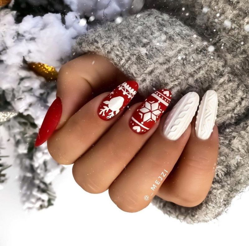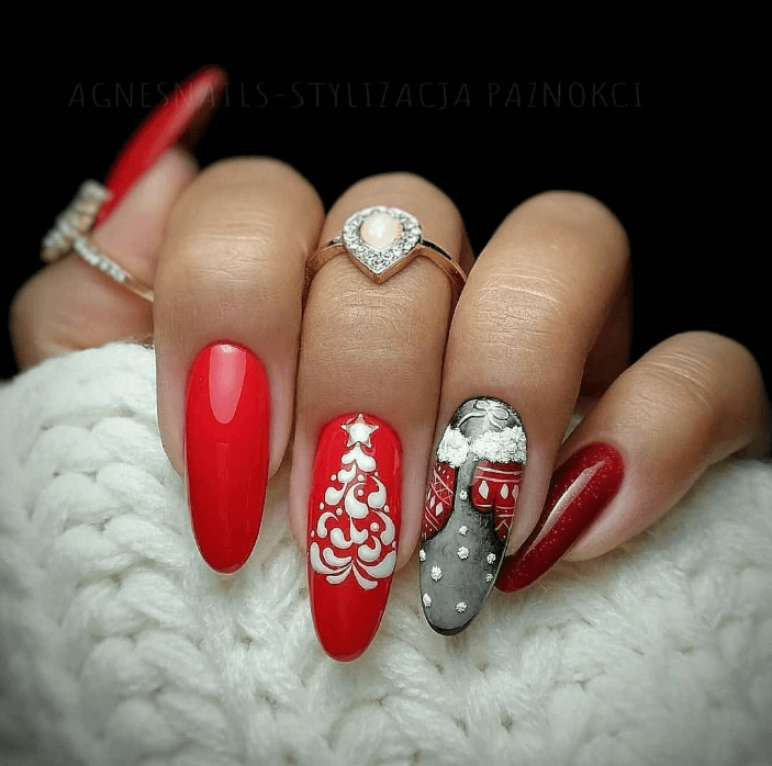 Для любительниц ярких новогодних дизайнов на миндальные ногти, алая палитра — идеальна. Ведь этот цвет сочетается со всеми оттенками: