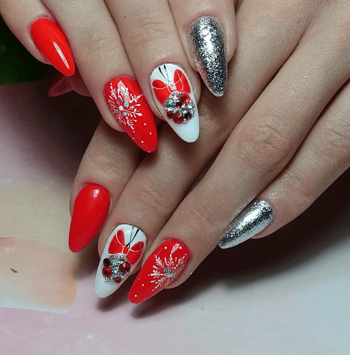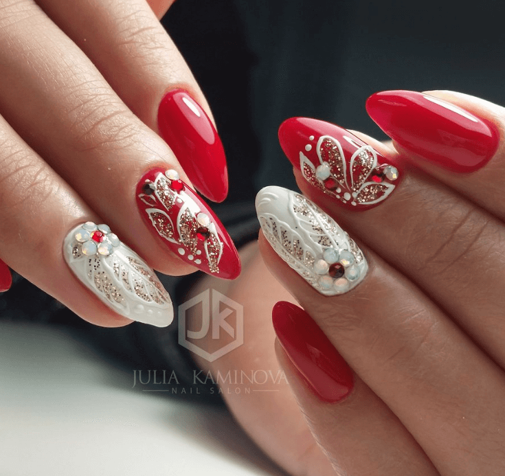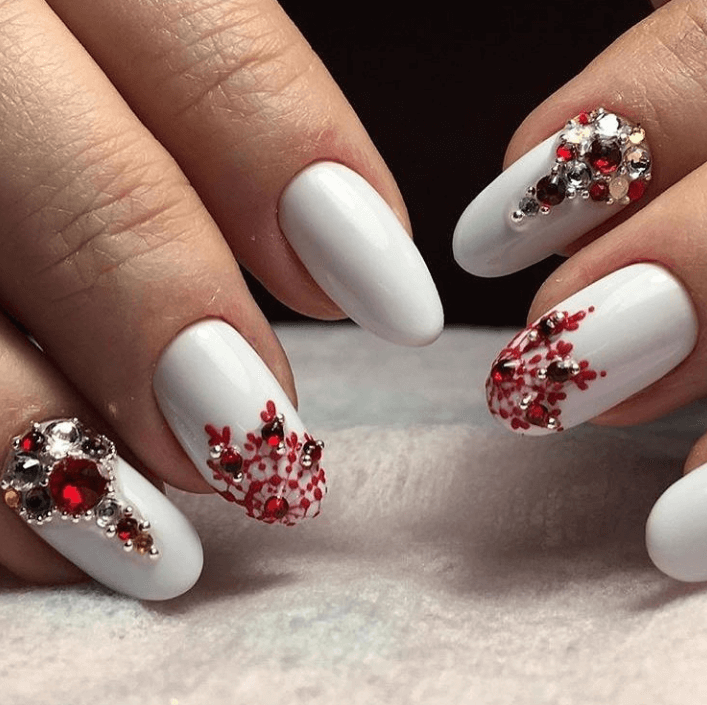 Стразы, блестки и другие декоры замечательно подходят к любому сочетанию. Главное помнить о том, что красный — очень яркий и сильный цвет и не переборщить с украшательством. Иначе стильный новогодний маникюр превратиться в безвкусный.
