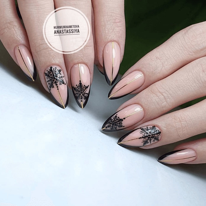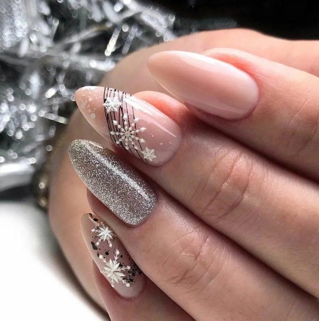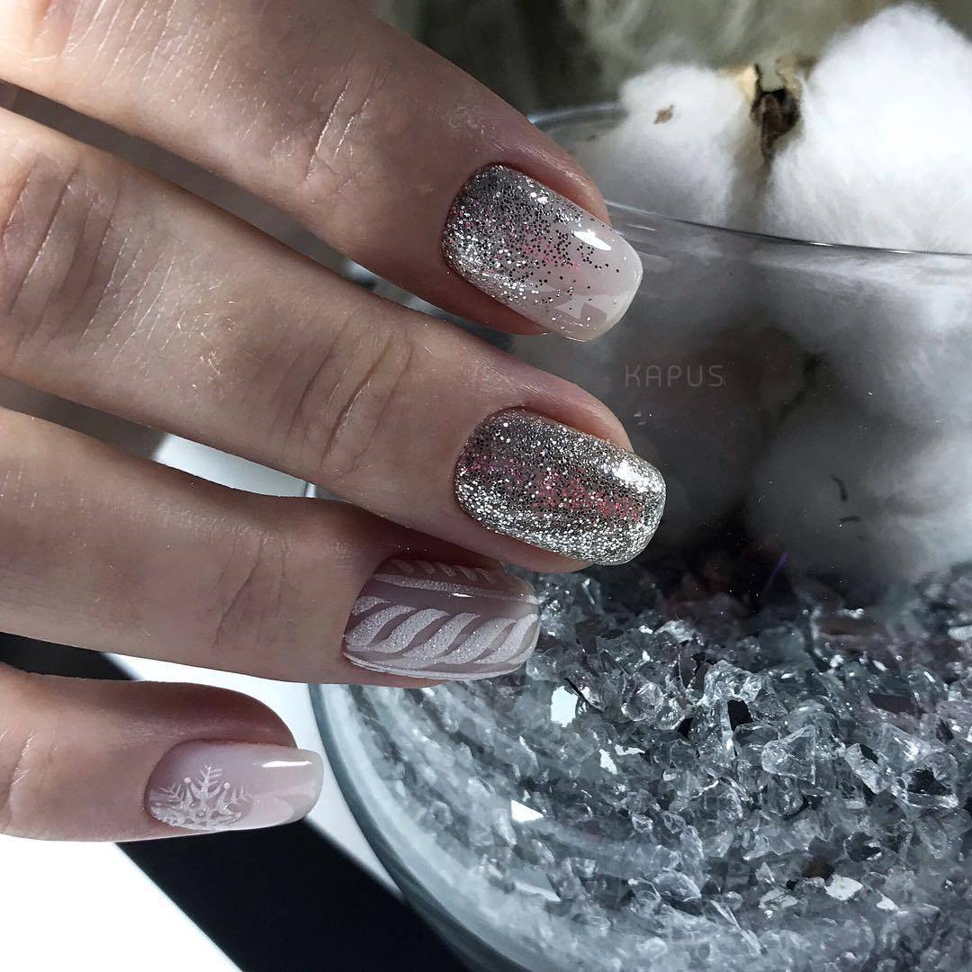 Серебристый глиттер, белые наклейки-снежинки, черная паутинка — и все вместе на нюдовой подложке выглядит нежно. Можно носить и каждый день.