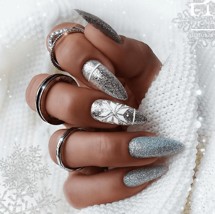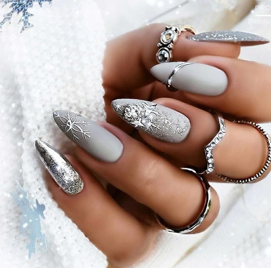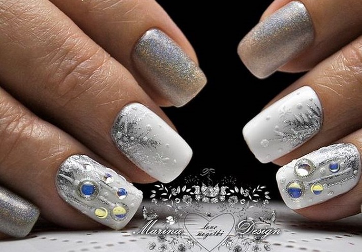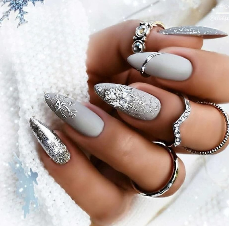 Серебро чаще служит ярким акцентом для других гель-лаков. Ведь этот тон универсален и как нельзя лучше подходит для зимы.