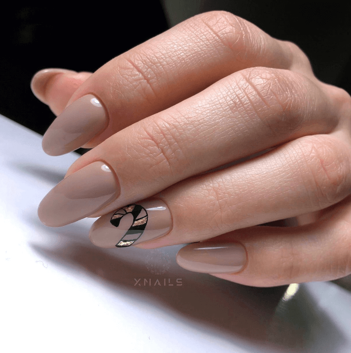 На бежевом фоне можно получить очень эффектный новогодний маникюр. Главное добавить пару ярких акцентов и удачно подобрать дизайн и длину миндаля.