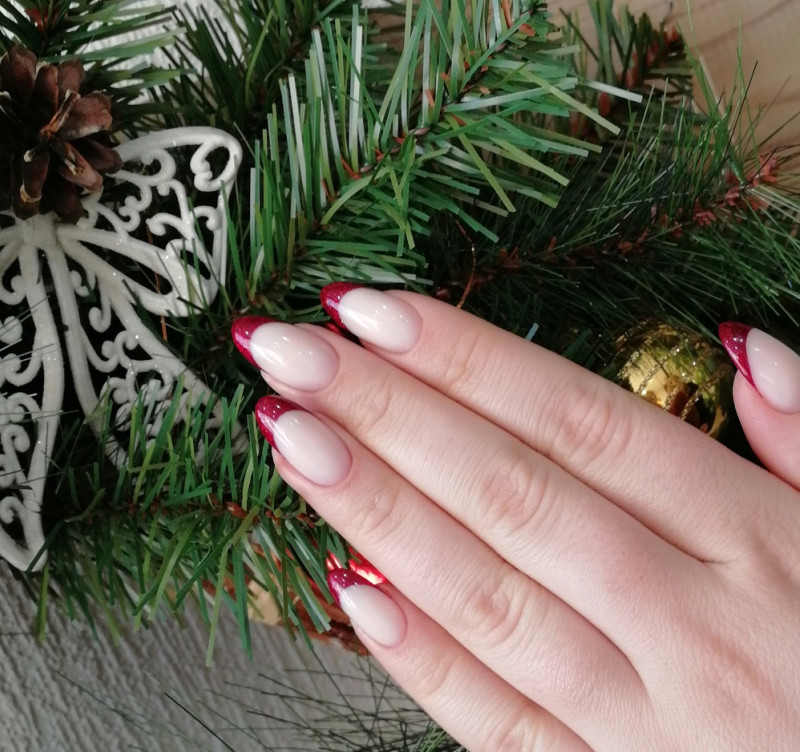 Для новогоднего френча на длинных ноготках можно выбрать нетрадиционное сочетание. Если нарисовать улыбку бордовым цветом, то ногти не будут казаться короче благодаря большой длине.