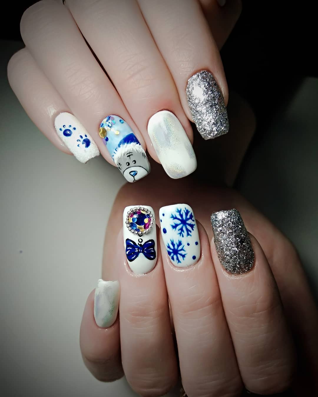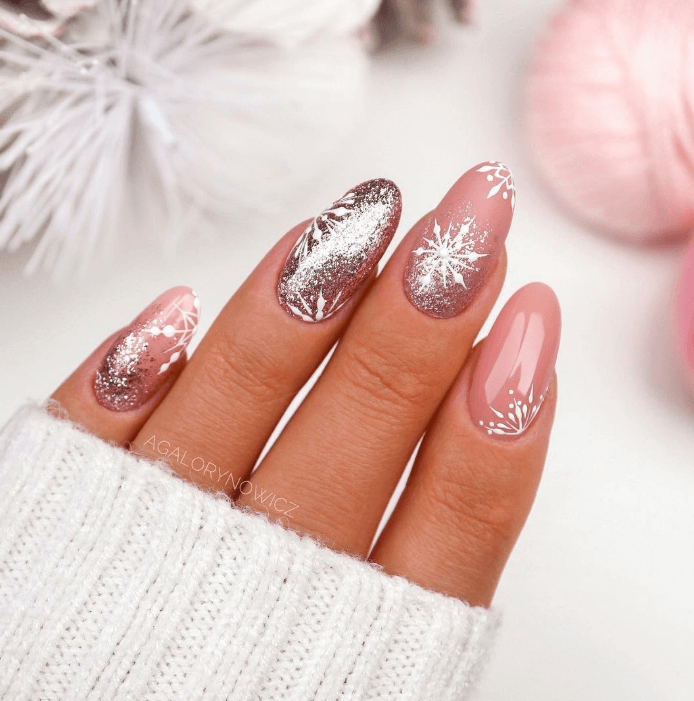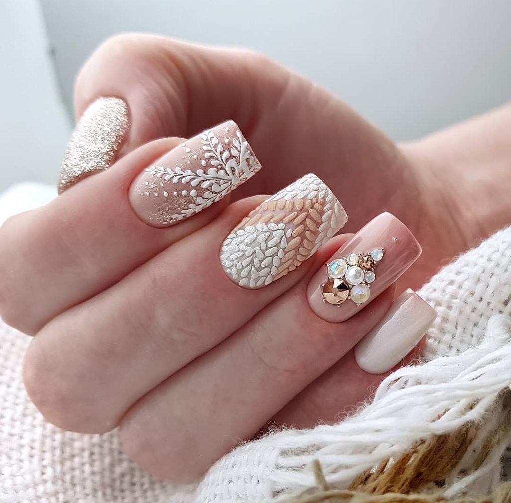 И снежинка, и вязаный маникюр, и инкрустация, и блестки… А выглядит очень нежно, мило и не броско.