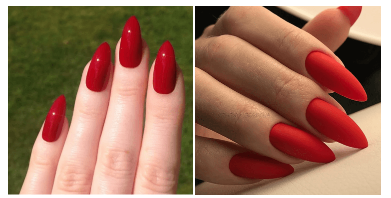 Качественный красный маникюр на длинный миндаль сам по себе выглядит шикарно, даже однотонный без дополнительных украшений.
