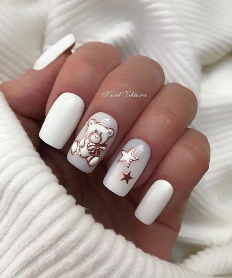 Вторая идея — зимняя тематика. Покрасьте ногти в белый цвет и добавьте декор, отражающий зиму и снежинки. Нарисуйте на ногтях изящные снежинки, используя белую и голубую краски или сделайте налепки со снежинками и приклейте их на ногти. Этот дизайн будет отлично смотреться на квадратной форме ногтей.