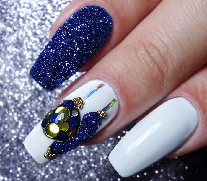 И, конечно же, не забудьте добавить к новогоднему маникюру немного сияющих страз, которые отразят свет и создадут эффект звездного неба на ваших ногтях.