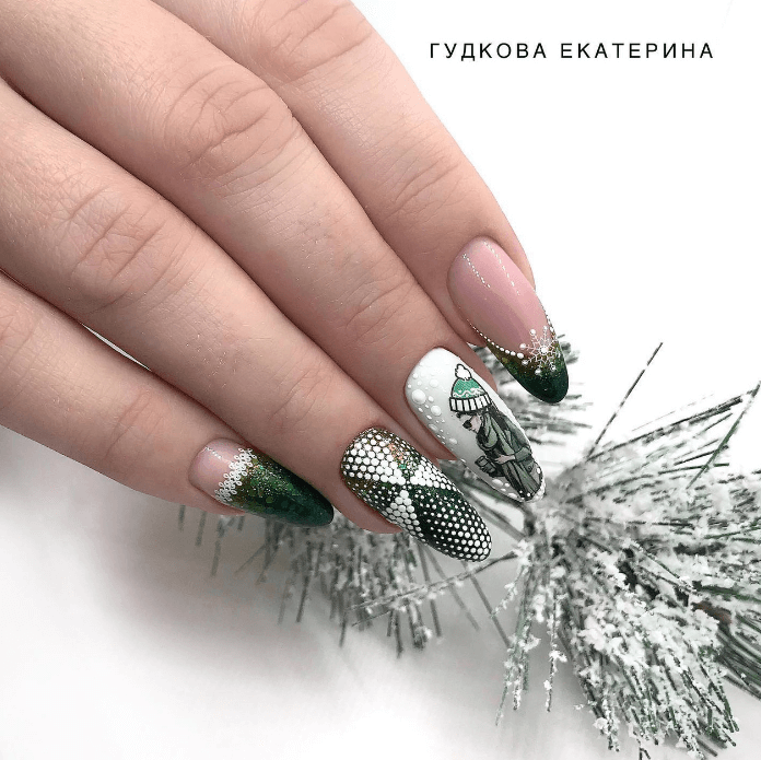 Не забывайте о классических новогодних цветах — красном и зеленом. Создайте красивый французский маникюр на миндальных ногтях с использованием этих цветов или сделайте акцент на одном ногтевом ложе и украсьте его рисунком в новогодней цветовой гамме.