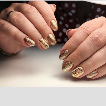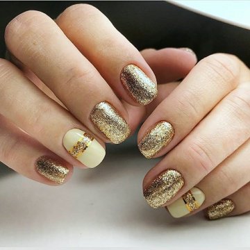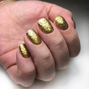 • Маникюр «битое стекло» – одна из не новых идей, но по-прежнему актуальных на арене мирового нейл-сервиса. Девушки разных возрастов, задействованные в различных сферах деятельности, целеустремленно выбирают именно этот маникюр, поскольку имитация из золотистых осколков фольги на фоне угольного черного базового покрытия смотрится удивительно стилизованно и эстетически красиво. • Золотистая слюда – особенно тематически данный вид декора смотрится на шоколадной основе базового покрытия в осеннюю пору, когда листва вокруг играет теплыми красками всевозможных оттенков рыже-красного. Подобного рода композиция выглядит необычно, но достаточно уместно в эту пору.• Роса на золоте – экстравагантный и удивительно красивый дизайн, предполагающий матовый ансамбль черного однотона в сочетании с глянцевым золотом одного из ноготков, обособленного имитацией из капелек воды, воссозданных прозрачным гелем. Выглядит такой маникюр потрясающе.