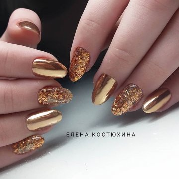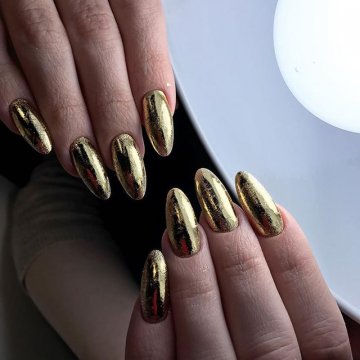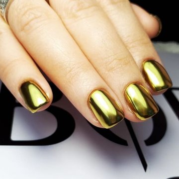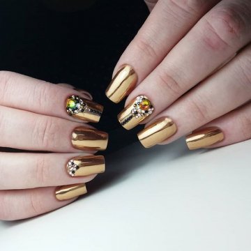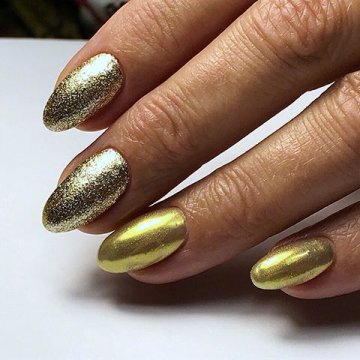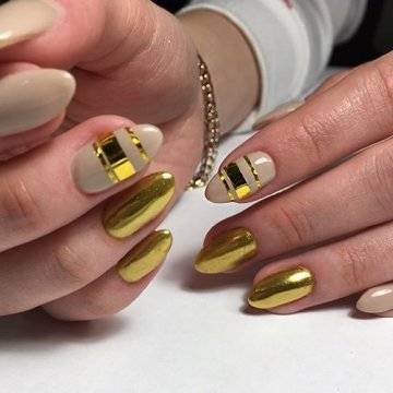 Зеркальный или голографический золотой дизайн в этом сезоне чаще всего можно увидеть на ногтях голливудских знаменитостей. Но он доступен каждой любительнице нейл-арта. Для зеркального дизайна понадобится пудра или фольга с соответствующей фактурой.