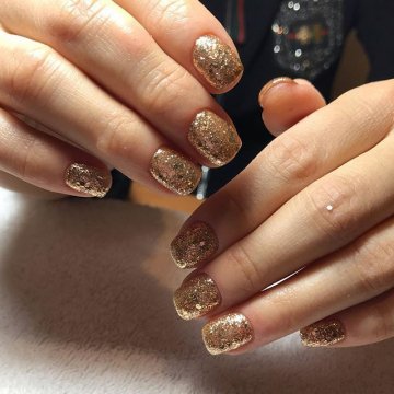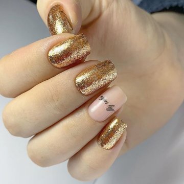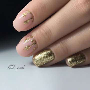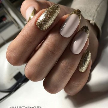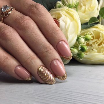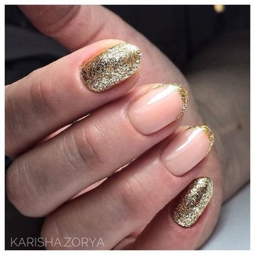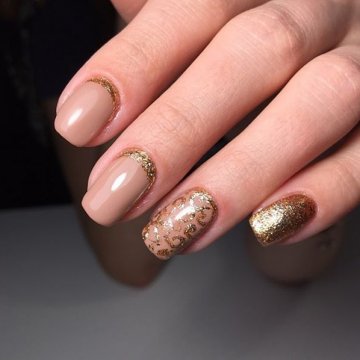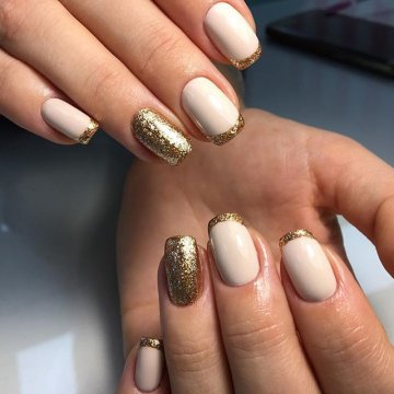 Любительницы лаконичного, нежного оформления чаще всего используют бежевый оттенок для основного покрытия. Кто-то считает такой маникюр слишком простым и скучным. В таком случае золотистые блестки будут идеальным украшением. Полоски, оттиски, геометрические детали или же полное покрытие – это лишь малая часть того, как именно можно оформить ноготки.
