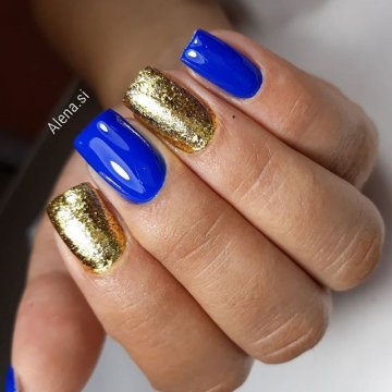 - Сочетание золотого и синего оттенков смотрится необычно, но вместе с тем элегантно. Вы может выбрать насыщенный синий цвет, что подойдет для создания образа утонченной и элегантной леди. А если вы сделаете золото в сочетании с голубым, то ваш маникюр будет смотреться изящно и ярко.
