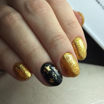 Черный маникюр с золотым блеском максимально эффектно будет смотреться на ручках красавиц. Такой нейл-арт понравится женщинам, которые ценят в своем образе богатство и роскошь.