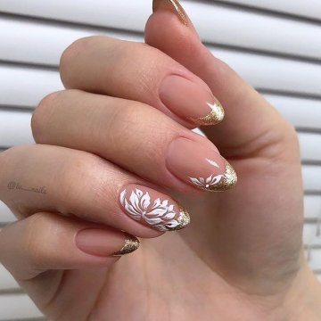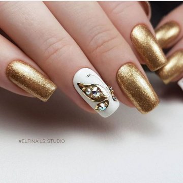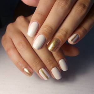 - Маникюр белый с золотом смотрится роскошно и статусно. Вместе с тем такое сочетание получается нежным и элегантным. Поэтому, если вы не хотите, чтобы ваш маникюр был слишком ярким, но при этом был стильным, то выбирайте такое сочетание цветов. Этот дизайн хорошо сочетается с любым стилем.