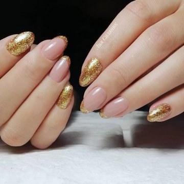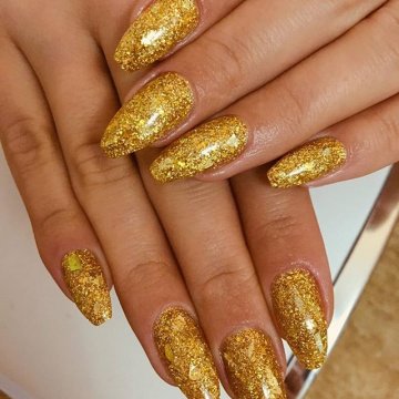 Золотой глиттер на ногтях в технике омбре выглядит очень элегантно в качестве покрытия на одном или двух ногтях.