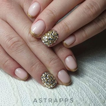 Советуем не просто покрыть лунки лаком оттенка драгоценного металла, но выделить их с помощью стразов, блесток. а вот база может быть какой угодно.
