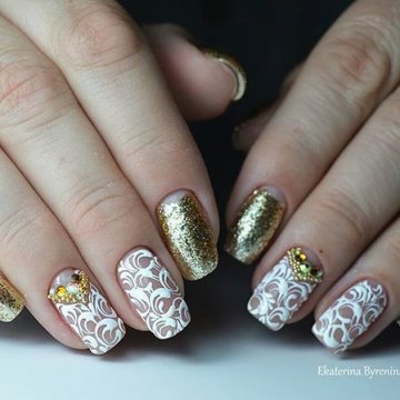 Классический белый цвет довольно часто используется в дизайне ногтей. Тем более, что вместе с золотым оттенком он выглядит особенно нежно и женственно. Такой маникюр может быть изумительным решением для романтического образа. Френч, легкие геометрические и абстрактные мотивы в золотистом цвете встречаются наиболее часто вместе с белым покрытием.