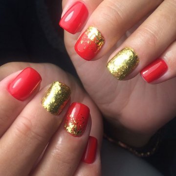 Алый, красный, вишневый – любой оттенок в сочетании с золотом выглядит по-настоящему роскошно. Все потому, что именно эти цвета ассоциируются со страстью и пылкими чувствами. В основном красные оттенки наносят на все ноготки, а лишь несколько из них украшают золотистыми вставками. Такое сочетание довольно яркое, но при этом не вызывающее. Поэтому этот маникюр модницы выбирают даже на каждый день. Также нередко красно-золотое сочетание оттенков применяют для создания тематического новогоднего оформления.