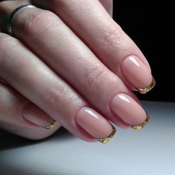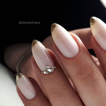 Кто сказал, что классический дизайн должен быть исключительно прозрачно-белым или нюдовым? Золотистый кончик ногтя не сделает пластину тяжелой, а классический прозрачный лак сделает ноготь более длинным и изысканным.