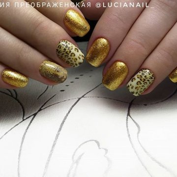 • зеркальный маникюр – идеальный вариант для коротких ноготков; при этом зачастую используется именно золотистая втирка, которая в конечном итоге удивительно играет светоотражающими бликами и имитирует настоящее золотое зеркало;• золотая «зебра» – очень необычно смотрится импровизация из хаотичных чёрных полосатых разводов поверх основного золотистого фона;• линейная геометрия – интересным сочетанием цветов и элементов декораций считается заполнение ногтевого ложа иссиня-сапфировым оттенком базового покрытия и наклеенными поверх него золотыми клейкими тонкими лентами в их параллельном следовании и перпендикулярном пересечении;• звёздный маникюр – глубокий фиолетовый цвет с камифубиками в виде золотых звезд смотрится очень эксцентрично, но поистине волшебно и магически на ноготках юной прелестницы.