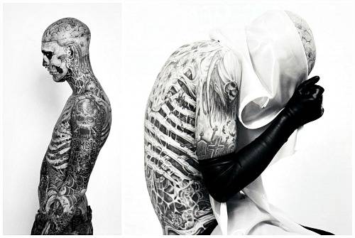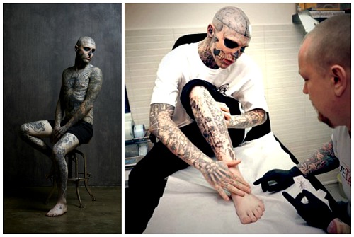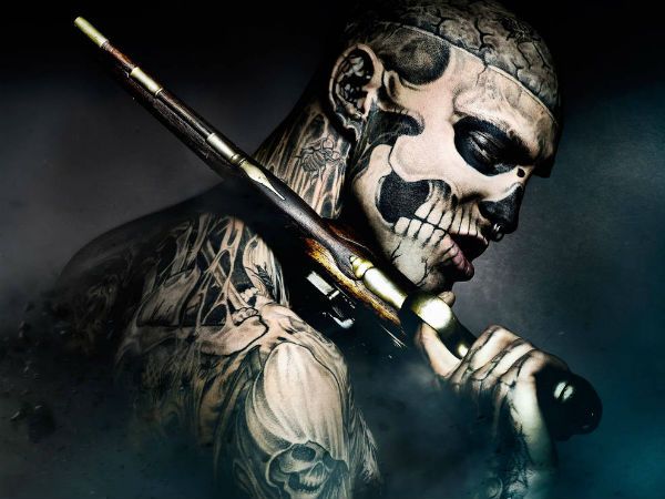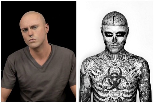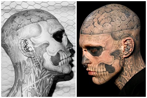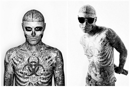Рик Дженест (Rick Genest), более известный сегодня как Зомби-бой (Zombie Boy), родился в 1985 году в Шатоге, в канадской провинции Квебек (Châteauguay, Quebec, Canada). Сегодня Рик известен из-за своих весьма необычных татуировок, превративших его в самого настоящего скелета. Так, тело Зомби-боя покрыто татуировками, символизирующими человеческий скелет. Глядя на лицо молодого человека, вы словно действительно видите череп, который словно просвечиает через его кожу. Примечательно, что с точки зрения анатомии тату Дженеста точны и полностью передают строение человеческого черепа.