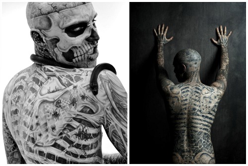 На данный момент самым популярным татуированным человеком в мире является человека-скелет или по-другому Рик Дженест. Его тело покрыто татуировкой, которая изображает человечески скелет. Он стал известным благодаря созданной страничке на фейсбуке, которая собрала более 1500000 подписчиков. Благодаря своему образу он принял участие в съемках клипа Леди Гаги и сыграл в фильме «47 ронинов». Но помимо Рика есть еще топ 5 самых татуированных людей: