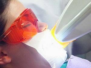 - Врач наносит на зубы, которые нужно отбелить, специальный гель, а над зубами устанавливает лампу. Зона улыбки засвечивается в течение 15 минут, затем оставшийся гель убирают полностью.