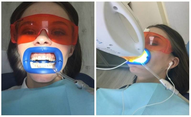 - Защита. Установка специальной накладки, которая защищает слизистую десен и губ от травматизации аппаратом. Нанесение защитного крема на десны и губы, который оградит от негативных влияний химических реагентов. На глаза также просят надеть очки.