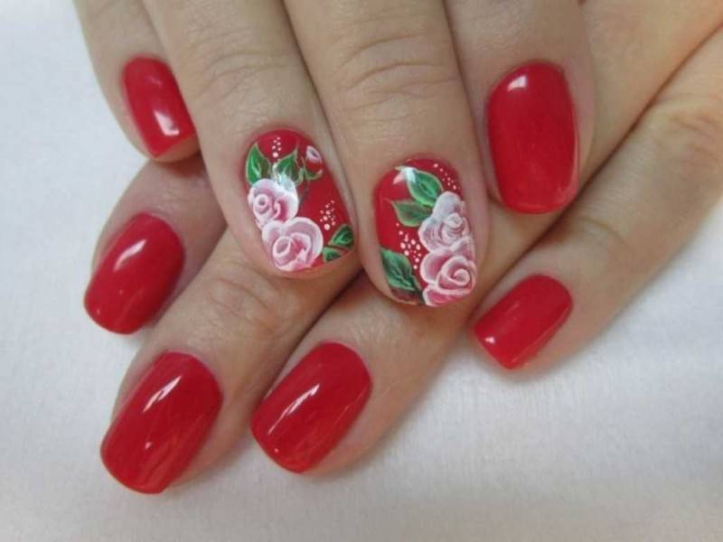 Самые красивые картины можно создать на длинных нарощенных ногтях, потому что площадь для рисования – большая. На коротких ногтях тоже можно сделать интересную композицию, если точно рассчитать размеры цветков и правильно разместить их на основе.