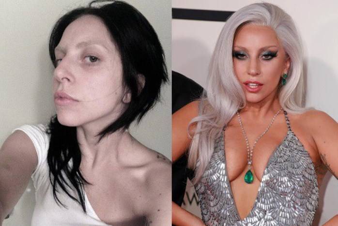 Леди Гага. Макияж является не только изюминкой Стефани Германотта, которая всем знакома как Леди Гага, но еще и инструментом для того, чтобы скрыть весьма непривлекательную внешность. В отличие от других знаменитостей она абсолютно не боится выкладывать свои фото без грима и фотошопа в социальные сети, тем самым показывая свое “настоящее я”.